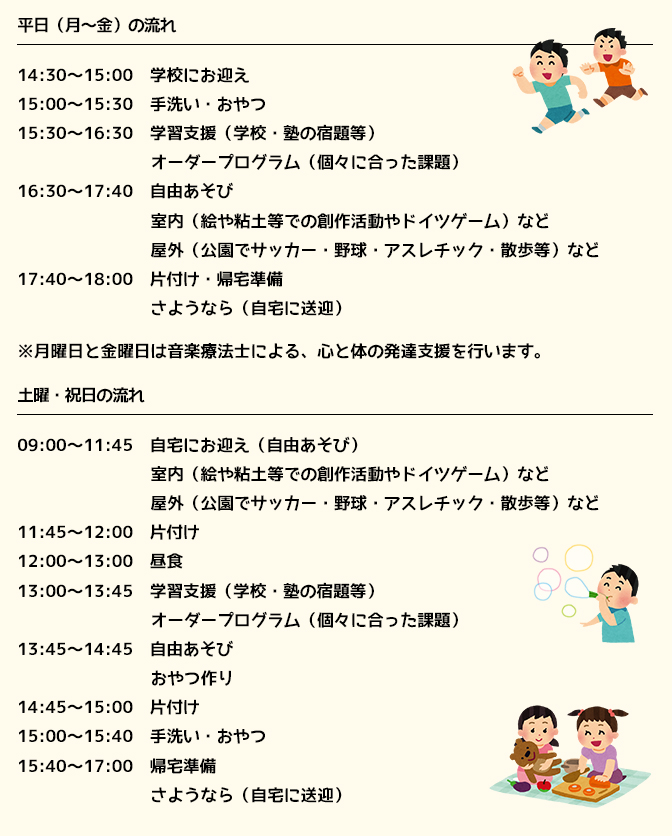 スケジュール・料金 ■スケジュール(ハート・ライフサービス) ■料金(ハート・ライフサービス) 利用料金は児童福祉法に基づき、利用料の10%が利用者負担となります。 但し、支払う料金の上限があり、これを上限額といい、各家庭の所得等に 応じて、0円・4600円・37200円/月の3段階があります。 ※一般的にはほとんどの方が4600円/月以下です。 ■スケジュール(はぁとふり〜) ■料金(はぁとふり〜) 利用料金は児童福祉法に基づき、利用料の10%が利用者負担となります。 但し、支払う料金の上限があり、これを上限額といい、各家庭の所得等に 応じて、0円・4600円・37200円/月の3段階があります。 ※一般的にはほとんどの方が4600円/月以下です。 ■スケジュール(ハートキャンバス) ■料金(ハートキャンバス) 利用料金は児童福祉法に基づき、利用料の10%が利用者負担となります。 但し、支払う料金の上限があり、これを上限額といい、各家庭の所得等に 応じて、0円・4600円・37200円/月の3段階があります。 ※一般的にはほとんどの方が4600円/月以下です。 ■スケジュール(ハーブ) ■料金(ハーブ) 利用料金は児童福祉法に基づき、利用料の10%が利用者負担となります。但し、支払う料金の上限があり、これを上限額といい、各家庭の所得等に 応じて、0円・4600円・37200円/月の3段階があります。※一般的にはほとんどの方が4600円/月以下です。 ■スケジュール(クスノキ) ■料金(クスノキ) 利用料金は児童福祉法に基づき、利用料の10%が利用者負担となります。但し、支払う料金の上限があり、これを上限額といい、各家庭の所得等に 応じて、0円・4600円・37200円/月の3段階があります。※一般的にはほとんどの方が4600円/月以下です。 ■スケジュール(Heart Seed) ■料金(Heart Seed) 利用料金は児童福祉法に基づき、利用料の10%が利用者負担となります。但し、支払う料金の上限があり、これを上限額といい、各家庭の所得等に 応じて、0円・4600円・37200円/月の3段階があります。※一般的にはほとんどの方が4600円/月以下です。